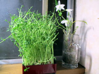 窓辺のオアシス 「ニョキニョキとよく伸びるね、外は寒いのに」 と、毎日感心しながら台所の窓辺においた豆苗を眺めていたら、そのさまが余りに面白くて とうとう食べそびれてしまった。 根元を2、3センチ残した豆苗の水栽培。 黄緑色の生糸のような細い茎に、小さなリボンみたいな葉をつけた豆苗のなんと可憐なこと。 それが数日もするとしっかりとした茎になり、葉の色も濃くなってぐんぐんと伸びるのだ。 か弱そうにみえるのに、なんと逞しいのだ! いまや伸びすぎた豆苗は観葉植物となっている。 窓辺の緑色はなんとも清々しく爽やかだ。 豆苗の横では一枝のセッコクが花をつけている。 植木鉢からはみ出した一枝を、グラスにいれておいたらなんと、健気に花をつけたのだ。 それも真っ白な聖女のような花を。 雑多なものであふれた台所に、白い花と豆苗はなんとも心を落ち着かせる。 台所の窓辺は小さな小さなオアシスだ。